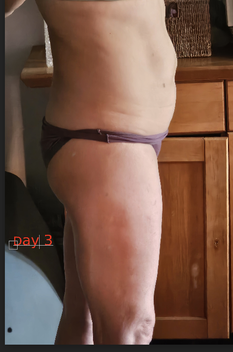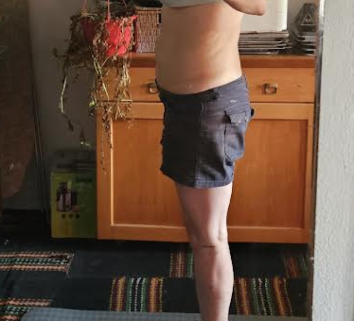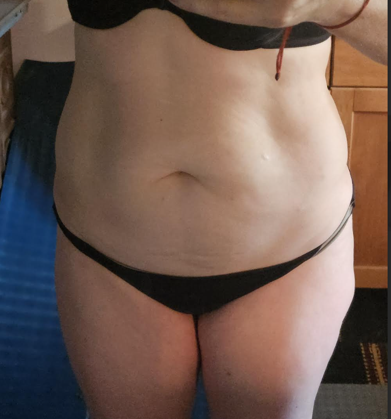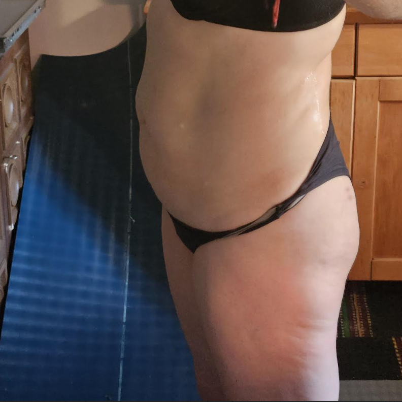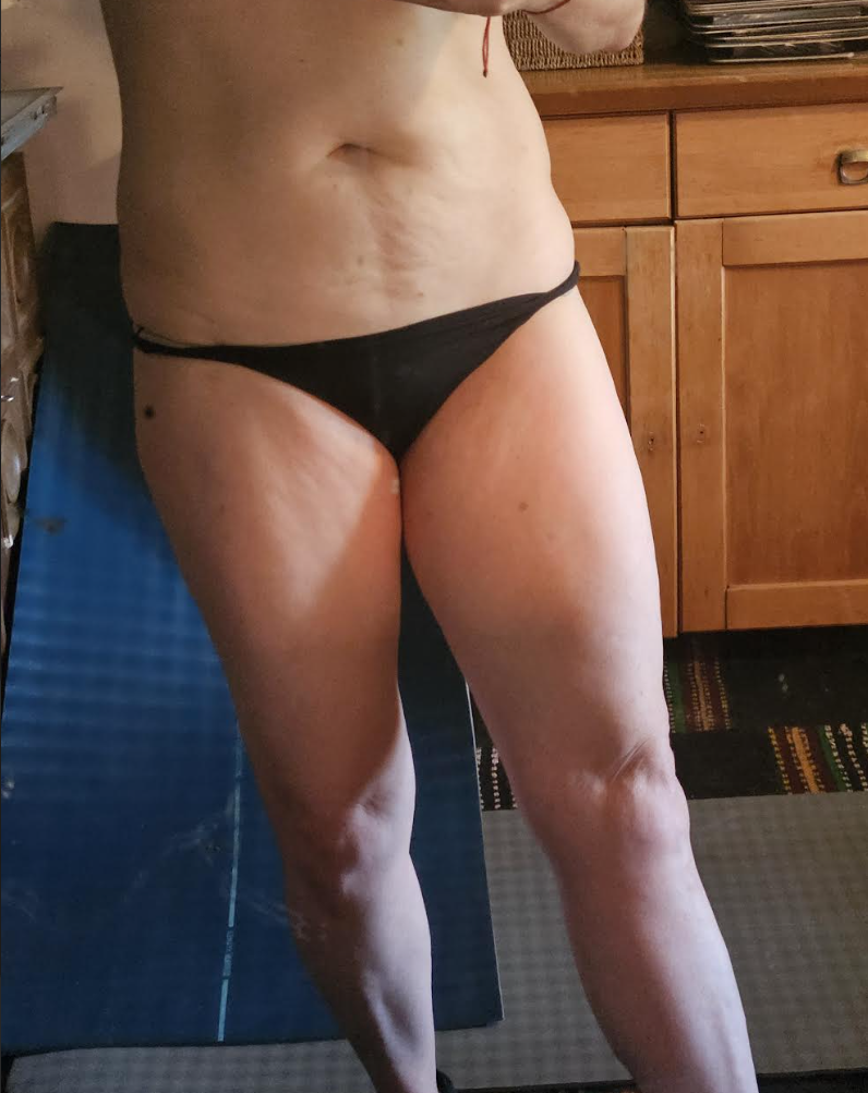 Anyway, you can see my core is just awful, but if you look down at my legs you can see I am muscular and tone there. My calves are like rocks.